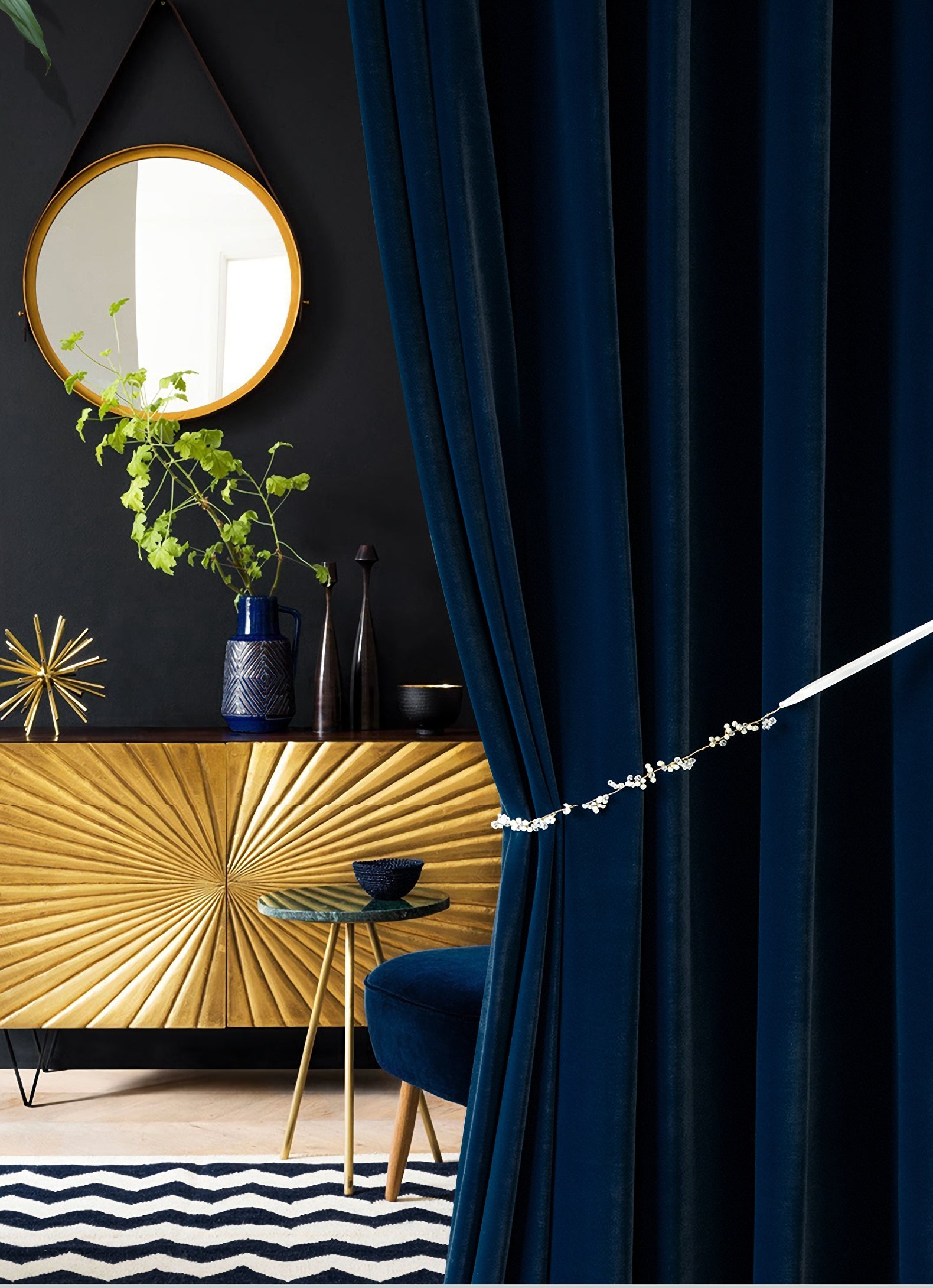 • Ironing the front of velvet is generally not recommended to avoid damaging its textured pile. If de-wrinkling is necessary, use a steam iron and iron from the backside of the velvet curtain while hanging.